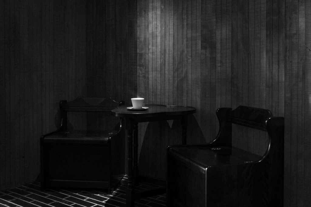先日アサコさんの展示に一緒に行った陽一さんと帰りに寄った居酒屋で、雰囲気に合うのではとのことで珈琲こ虎の白黒写真のデータをみせてくれた。白黒の方が色の情報を抜きに光や斑が際立ってみえるので、今回は白黒の方が写真として適している気がする。